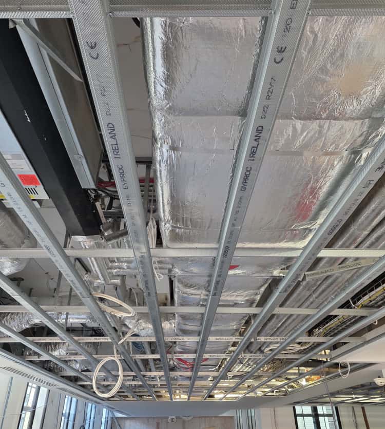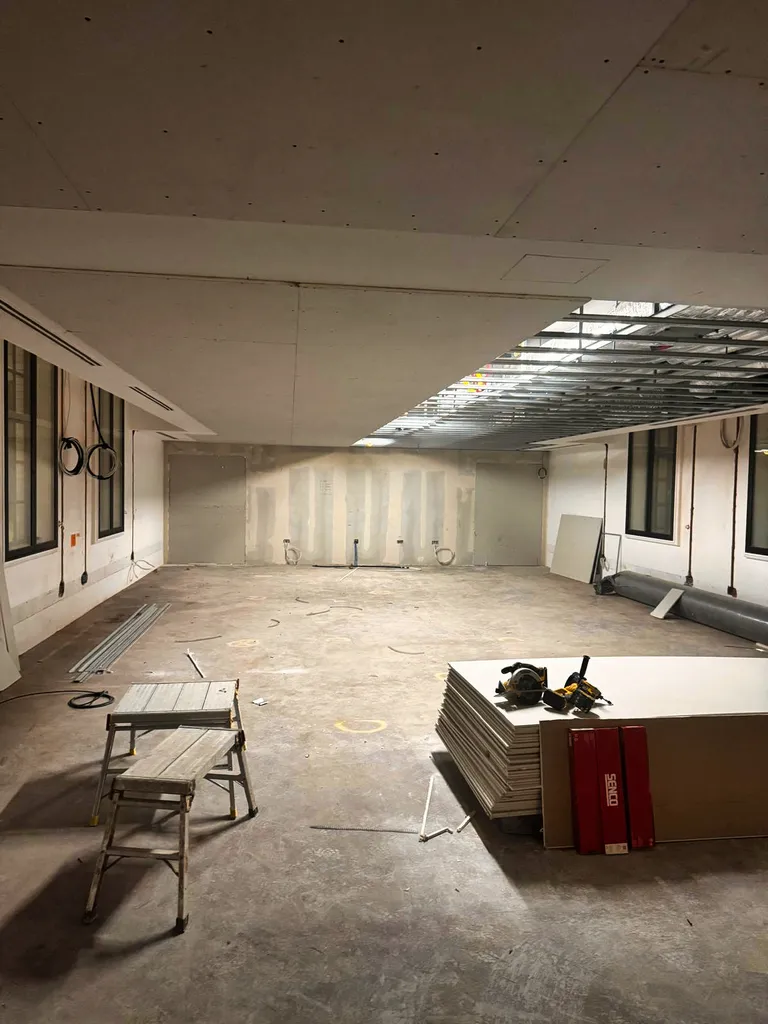 Installation of acoustic ceilings, decorative finishes, and feature lighting.